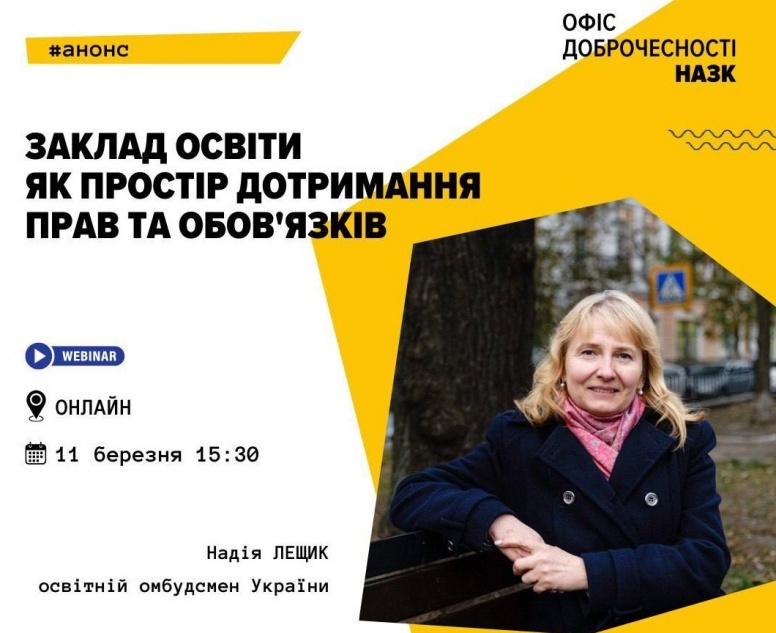 Сьогодні наші педагоги взяли участь у важливому вебінарі, організованому Офісом доброчесності Національного агентства з питань запобігання корупції. Спікером заходу була освітня омбудсменка України Надія Лещик, яка розповіла про принципи доброчесності в освіті, роль педагогів у формуванні прозорого навчального середовища та механізми протидії корупційним ризикам у закладах освіти.