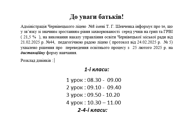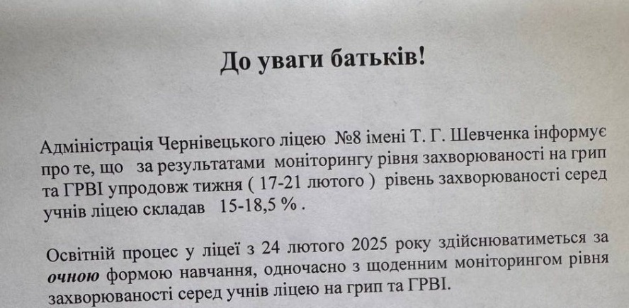 Адміністрація Чернівецького ліцею №8 імені Т. Г. Шевченка інформує про те, що у зв’язку зі значним зростанням рівня захворюваності серед учнів на грип та ГРВІ ( 21,5 % ), на виконання наказу управління освіти Чернівецької міської ради від 21.02.2025 р. №44, педагогічною радою ліцею ( протокол від 24.02.2025 р. № 5) ухвалено рішення про переведення освітнього процесу з 25 лютого 2025 р. на дистанційну форму навчання.